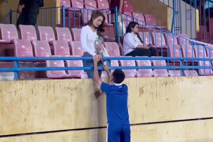 Khi nhận ra bạn gái có mặt, Đức Huy lập tức chạy lại khán đài. Tiền vệ sinh năm 1995 mang theo chai nước, ân cần hỏi han và chăm sóc người yêu. Khoảnh khắc thân mật giữa cả hai thu hút sự chú ý của nhiều người có mặt trên sân. Sau vài phút trò chuyện ngắn, cầu thủ của CA TP.HCM nhanh chóng trở lại sân để tiếp tục khởi động, chuẩn bị cho trận đấu.