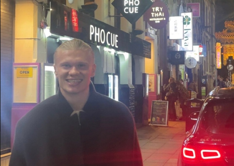 Haaland chụp ảnh trước nhà hàng Việt Nam.