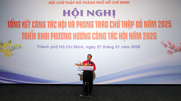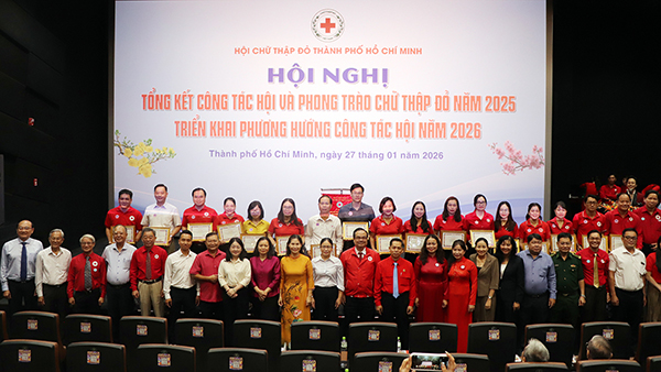 Sáng ngày 27/01, Ban Thường vụ Hội Chữ thập đỏ Thành phố Hồ Chí Minh long trọng tổ chức Hội nghị tổng kết công tác Hội và phong trào Chữ thập đỏ năm 2025, triển khai phương hướng, nhiệm vụ năm 2026. Tham dự Hội nghị có ông Vũ Thanh Lưu - Phó Chủ tịch Hội Chữ thập đỏ Việt Nam; bà Huỳnh Thị Phúc - Thành ủy viên, Phó Trưởng đoàn chuyên trách Đoàn Đại biểu Quốc hội Thành phố; bà Lê Thị Kim Thu - Thành ủy viên, Phó Chủ tịch Hội Liên hiệp Phụ nữ Thành phố; bà Nguyễn Thị Kim Loan - Thành ủy viên, Phó Chủ tịch Liên đoàn Lao động Thành phố; bà Nguyễn Thị Tuyết Minh - Phó Trưởng ban Tuyên giáo và Dân vận Thành ủy; ông Trần Văn Tuấn - Phó Chủ tịch (phụ trách chung) cùng tập thể Thường trực Hội Chữ thập đỏ Thành phố; đại diện lãnh đạo các sở, ngành, đơn vị, các cấp Hội phường, xã, đặc khu và đông đảo cán bộ, hội viên, tình nguyện viên tiêu biểu.